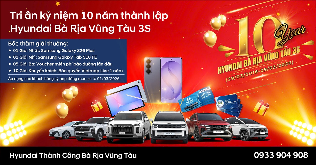 Nhân dịp kỷ niệm 10 năm Hyundai Bà Rịa Vũng Tàu 3S (29/03/2016 – 29/03/2026),